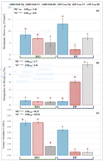 Effect of packaging film and sterilization treatment on (a) maximum stress, (b) elongation at break and (c) Young’s modulus of. TQ = original sample, UV = UV treated film; and RF = RF treated sample. Different red letters above bars indicate significant differences at p < 0.05 (LSD test). *** Main effects significant at p ≤ 0.001. ns = not significant. Error bars are also reported.