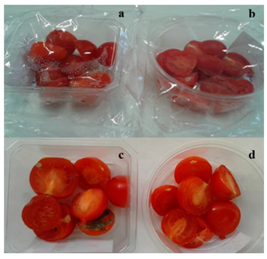 Cherry tomatoes packed in (a,c) non-biodegradable PP Coex/PET and (b,d) compostable biopackage BIO E946/PLA, after (a,b) 0 and (c,d) 18 days.