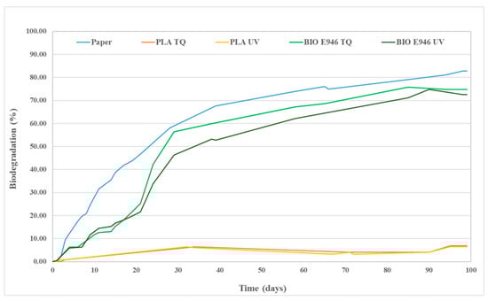 Biodegradation (%) as a function of time of PLA trays, BIO E946 film, UV treated and not (TQ) and paper (positive reference).
