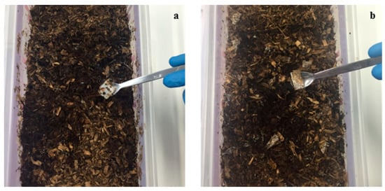 Photographic documentation of (a) PLA and (b) BIO E946 pieces after one week of disintegration test at 58 °C.