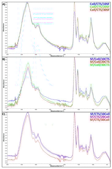 The ATR-FTIR spectra of the three-component scaffolds cross-linked by glyoxal solutions: (A) Coll/CTS mixture with 10, 20, and 30% SF; (B) SF/Coll mixture with 10, 20, and 30% CTS; and (C) SF/CTS with 10, 20 and 30% Coll.