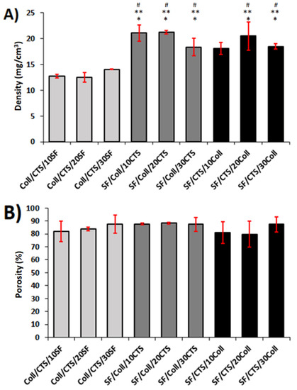 The density (A) and porosity (B) of 3D scaffolds (n = 3, mean ± SD, * significantly different vs. Coll/CTS/10SF, ** significantly different vs. Coll/CTS/20SF, # significantly different vs. Coll/CTS/30SF, p < 0.05).