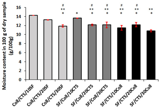 The moisture content of scaffolds is shown in Figure 3. The results were expressed as grams of water in 100 g of dry sample weight. The highest moisture content was observed for Coll/CTS/10SF scaffolds (14.29 g/100 g), while the lowest was for the SF/CTS/30Coll sample (only 10.84 ± 0.22 g/100 g). These are similar results to those in Coll (14.60 g/100 g) [59] and slightly lower results in our previously published report for Coll (13.30 ± 0.79 g/100 g), SF/Coll (17.33 ± 0.30 g/100 g), and SF/Coll/CTS (19.60 ± 1.35 g/100 g) cross-linked by dialdehyde starch [60]. However, the moisture content for all the samples was on a similar level (in the range of 10.84 to 14.29 g/100 g).