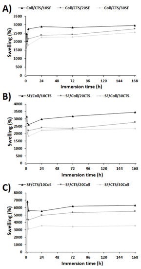 Swelling degree of the three-component materials cross-linked by glyoxal solution: (A) Coll/CTS mixture with 10, 20, and 30% SF; (B) SF/Coll mixture with 10, 20, and 30% CTS; and (C) SF/CTS with 10, 20, and 30% Coll (n = 3).
