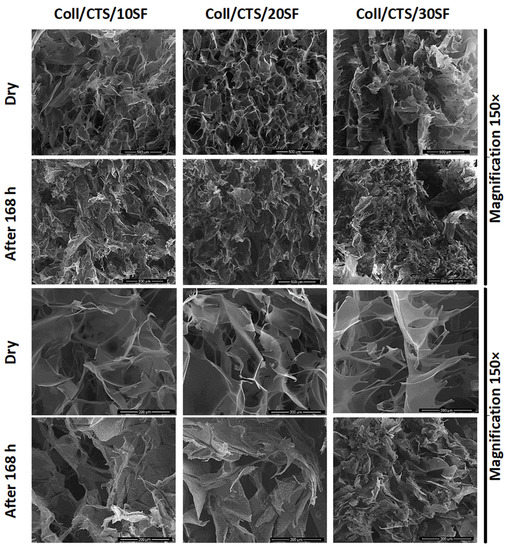 SEM images (magnification 500× and 150×) of Coll/CTS mixtures with 10, 20, and 30% SF (left to right columns) for dry scaffolds and after 168 h of immersion in PBS.