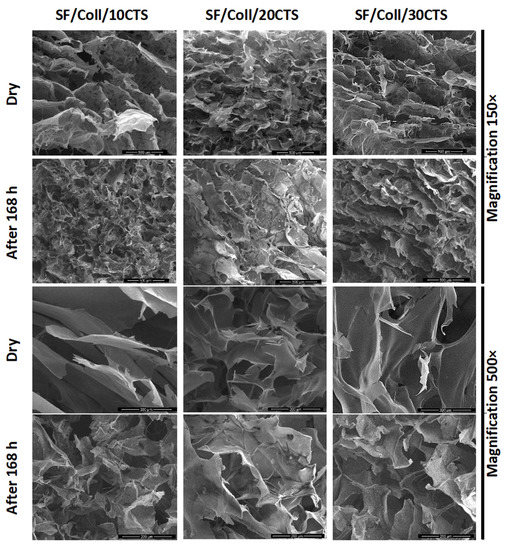 SEM images (magnification 500× and 150×) of SF/Coll mixtures with 10, 20, and 30% CTS (left to right columns) for dry scaffolds and after 168 h of immersion in PBS.