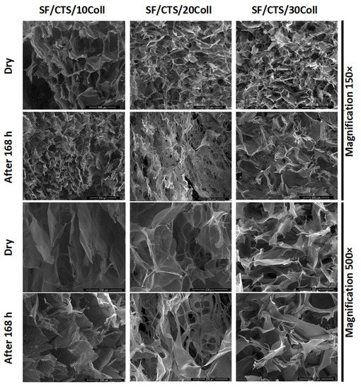 SEM images (magnification 500× and 150×) of SF/CTS mixtures with 10, 20 and 30% Coll (left to right columns) for dry scaffolds and after 168 h of immersion in PBS.