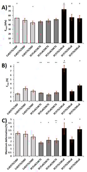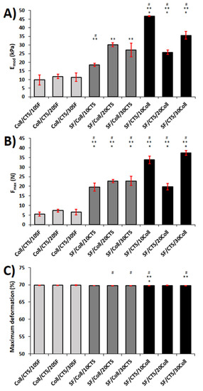Results ((A) Young’s modulus, (B) maximum force, and (C) maximum deformation) of the mechanical testing in room conditions (temperature and humidity) for each kind of scaffold (n = 5, mean ± SD, significantly different vs. Coll/CTS/10SF, * significantly different vs. Coll/CTS/20SF, # significantly different vs. Coll/CTS/30SF, p < 0.05).