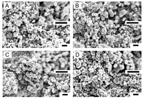 SEM pictures of cross-sections of PTMC/CaCO3 composite films. (A) PTMC/30; (B) PTMC/40; (C) PTMC/50; (D) PTMC/60. Scale bars 1 μm.