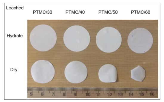 Macroscopic images of leached PTMC/CaCO3 composite films in hydrated and dry state.
