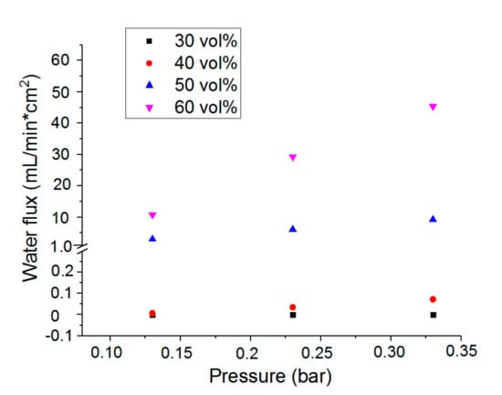 Water flux through the microporous PTMC films, vol % refers to the amount of CaCO3 particles used during preparation of the films.