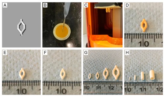 A branched vascular structure was designed as shown in Figure 6A. The resin for SLA-based printing contained PTMC, CaCO3, photoinitiator TPO-L and Orasol Orange G dye in propylene carbonate diluent. The composition of the resin is shown in Table 1 and a macroscopic image of the resin in Figure 6B. Based on the above percolation threshold study, 45 vol % CaCO3 relative to the PTMC matrix was chosen as a leachable component for the creation of a microporous structure. The Orasol Orange G dye content was optimized to ensure a proper curing depth as previously described [34]. Branched vascular structures were successfully built and extracted, see Figure 6D,E, respectively. As complete leaching of these structures was not possible due to pore collapse, a postcuring step was implemented after extraction. After printing in various shapes and sizes, postcured structures could be fully leached as shown in Figure 6F–H.