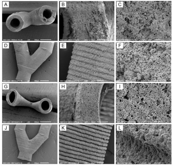 SEM images of the vascular structures shown in Figure 6E,F are presented in Figure 7. Cross-sections showed branched open tubular structures, both in the case of nonleached and leached samples (Figure 7A,G, respectively). The outer surfaces clearly showed that the structures were built layer by layer, see Figure 7D,E,J,K. Cross-sections of nonleached samples showed CaCO3 particles, which were replaced by pores after leaching (Figure 7C,F,I,L, respectively).