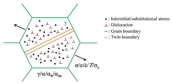 An individual austenite grain is separated from other counterparts by its grain boundaries. The austenite grain interior is distributed with various defects including the interstitial/substitutional atoms, dislocations, and possibly twin boundaries (Figure 1). The above defects including the grain boundaries affect the austenite stability. These defects are inherent to the single austenite grain, intrinsically affecting its stability, and thus could be termed as the intrinsic factors. In contrast, the adjacent grains may also affect the stability of interested austenite grain via stress/strain partitioning, thus the effect associated with the adjacent grains is termed as the extrinsic factors (Figure 1).