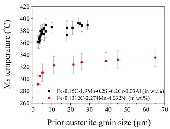 where Vγ represents the volume of austenite grain. Ms0 is the temperature determined by the chemical compositions, besides C content. A = 423 wt.%/°C according to Andrew’s equation [35]. B is a fitting parameter that can be determined through the experimental data. According to Equation (4), the smaller grain size leads to a higher Ms temperature, which can be verified in steels with different chemical compositions (Figure 3).