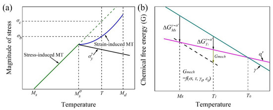 where fα’ is the volume fraction of transformed martensite and α and β are the martensitic nucleation rate and the possibility of a martensite embryo at the shear bands, respectively. Martensitic transformation is a nucleation dominated process, thus the nucleation site or embryo created by plastic deformation is important for the formation of martensite during plastic deformation. Nevertheless, it should be noted that the strain-induced martensitic transformation also involves the applied stress that contributes to the martensitic transformation in terms of mechanical interaction energy [92,95]. It is expected that the stress (σb) required to induce the martensitic transformation during plastic deformation could be lowered as compared with the critical stress (σc) for stress-induced martensitic transformation (Figure 5a), which may be considered as the specific contribution from the creation of the nucleation site by plastic deformation. Nevertheless, the exact role of applied stress on the growth of the martensite embryo created by the plastic deformation needs to be clarified.