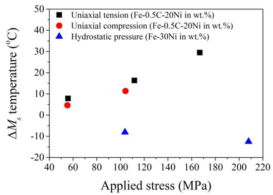 The martensitic transformation is facilitated by the uniaxial tensile stress and is less aided by the uniaxial compressive stress (Figure 6) [87]. This is because the uniaxial compressive stress can be resolved into the stress components, where the normal stress opposes the transformation while the shear stress facilitates the transformation [87]. The martensitic transformation is suppressed by the hydrostatic pressure because the hydrostatic pressure opposes the expansion of martensitic transformation (Figure 6) [105]. The increased Ms temperature induced by uniaxial stress state as predicted by the Patel–Cohen model is highly consistent with the experimental observation. However, the prediction of the effect of hydrostatic pressure on Ms temperature yields with a ratio of −5.5 °C for every 100 MPa, which is slightly lower than the experiments [87]. Besides, the linear relation between the decreased Ms temperature and the applied hydrostatic pressure breaks when it is higher than 750 MPa for Fe–Ni alloy [106], which could be owing to the Invar effect on volume expansion of martensitic transformation under hydrostatic pressure [107]. A tensile hydrostatic pressure could be generated on the austenite grains embedded in the ferritic matrix owing to the different thermal expansion ratio and may facilitate the martensitic transformation [28]. An analytical model is derived to explain the change of Ms temperature under the complex stress state [108]. It is found that the change of Ms temperature is mainly affected by the maximum and minimum principal stress and is independent of the intermediate principal stress [108]. A more sophisticated self-consistent model by considering the orientation relationship is developed to evaluate the effect of the stress state on the austenite stability [109].