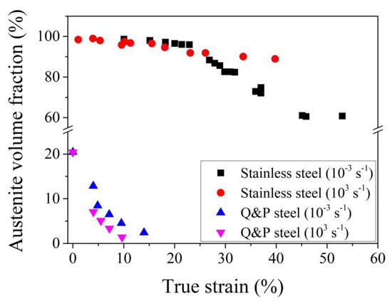 Evolution of austenite volume fraction in stainless steel [112] and quenching and partitioning (Q&P) steel [138] at different strain rates.