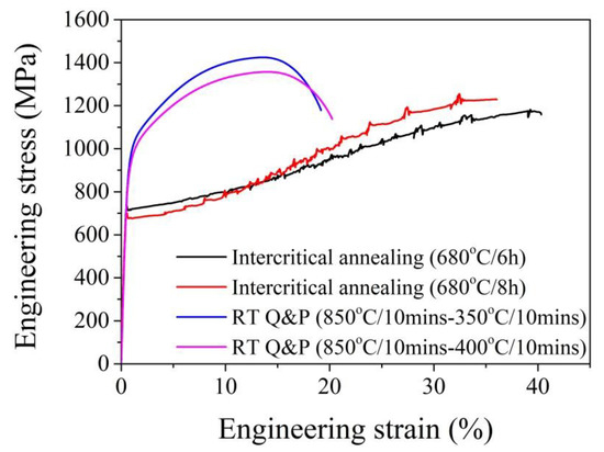 Engineering stress–strain curves of a medium Mn steel (Fe-10Mn-0.2C-2Al-0.1V in wt.%) treated by different thermal processes including intercritical annealing and room temperature quenching and partitioning (RT Q&P).