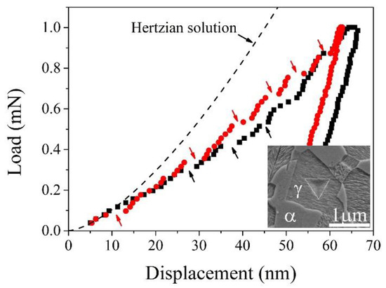 Different from the macroscopic tensile test, the nanoindentation test armed with a sharp indenter is effective in obtaining the mechanical stability of single austenite grains [148,149]. The formation of martensite beneath the indenter may contract along the indentation loading direction, generating a strain burst or pop-in in the load–displacement (P–h) curve (Figure 10) [148]. Nevertheless, not all the pop-ins shown in the P–h curve represents the formation of martensite beneath the indenter. By fitting the elastic part of the P–h curve using the Hertzian solution, it is generally found that deviation of the P–h curve from the Hertzian solution is accompanied by a pop-in (Figure 10), which could represent the incipient plasticity or nucleation of dislocation [150]. The second pop-in could be induced by the formation of martensite beneath the indenter because the deformation mode is changed [149,151]. Therefore, the load corresponding to the occurrence of the second pop-in may represent the critical load to initiate the formation of martensite in the single austenite grains. The critical load is found to increases with the Mn content, confirming that the Mn element is an effective austenite stabilizer [149]. Consequently, the effect of chemical compositions such as Mn content on the austenite stability can be examined by the nanoindentation test. It is found that the grain refinement suppresses the occurrence of strain burst in metastable stainless steel, suggesting that the grain refinement contributes to the austenite stability [152]. The influence of the prior martensite on the austenite stability has been investigated by nanoindentation [153]. It is found that the prior martensite stabilizes the remaining austenite grains by the hydrostatic pressure and the dislocations, both of which result from the formation of adjacent martensite [153,154]. Therefore, it is believed that the nanoindentation test is a useful technique to determine the intrinsic effect on the austenite stability as the indented volume is generally confined within an individual austenite grain.