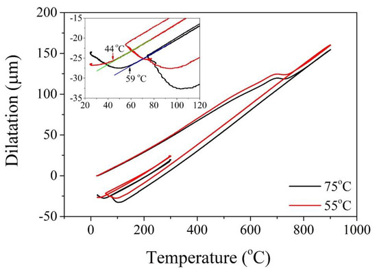 Dilation–temperature curves of medium Mn steel (Fe-8Mn-0.25C in wt.%) subjected to the quenching and partitioning process. The quenching temperature (QT) is either 55 °C or 75 °C, while the partitioning is at 300 °C with a duration of 60 s. The Ms temperature decreases after partitioning in comparison with the quenching temperature, confirming the partitioning of C from martensite to austenite.
