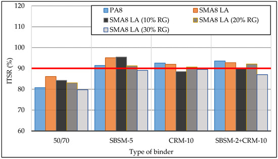 - The type of binder affects the water damage resistance (ITSR) of SMA8 LA mixtures. Modified binders contribute to the increase of ITSR by about 10% compared to mixtures with bitumen 50/70. The replacement of mineral aggregate by rubber granulate slightly reduces the water damage resistance of SMA8 LA mixtures.