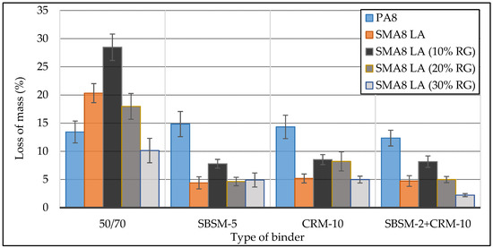 - The increase in the addition of rubber granulate in SMA8 LA mixtures improves their resistance to degradation in the Cantabro abrasion loss test. The highest degradation resistance achieved SMA8 LA (30% RG) mixtures with copolymer modified bitumen and crumb rubber (SBSM-2 + CRM-10). SMA8 LA mixtures with modified binders are characterized by greater resistance to degradation compared to SMA8 LA with bitumen 50/70. The application of modified binders improves the degradation resistance of SMA LA mixtures by 3–4 times.