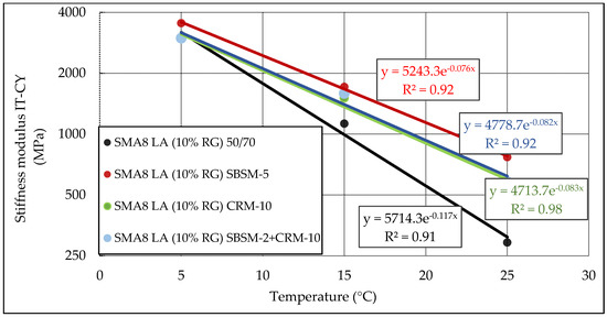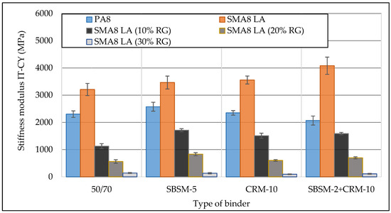 - SMA8 LA, SMA8 LA (10% RG) and SMA8 LA (20% RG) mixtures with modified binders are characterized by higher stiffness modulus values compared to those mixtures with bitumen 50/70. SMA8 LA mixture with modified bitumen with simultaneous copolymer and rubber modification (SBSM-2 + CRM-10) achieved the highest value of stiffness modulus—4082 MPa. This is a 25% increase in modulus value compared to the mixtures with bitumen 50/70. The addition of rubber granulate replacing mineral aggregate reduces the values of stiffness modules of SMA8 LA mixtures.