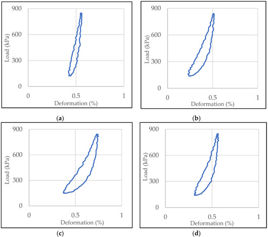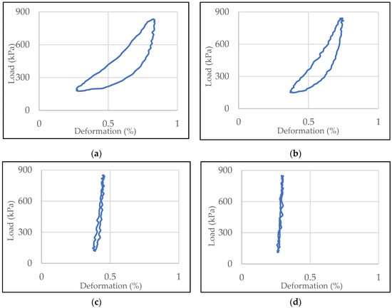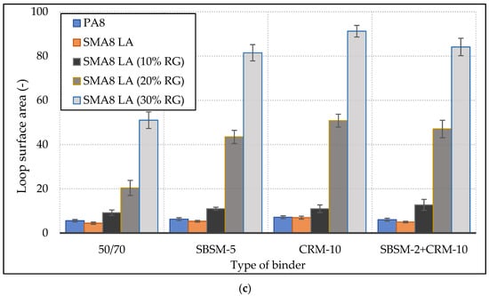 - The addition of rubber granulate to SMA8 LA mixtures has a very significant impact on the elasticity of the mixtures. Increasing the addition of granulate causes an increase in the hysteresis loop area. The highest loop area values were obtained for SMA8 LA (30% RG) mixture with binder modified by rubber (CRM-10). This value is higher by 44% in relation to SMA8 LA (30% RG) with bitumen 50/70, by about 40%- in relation to the mixture with SBSM-2 + CRM-10 and by 37%—in relation to the mixture with SBSM-5.