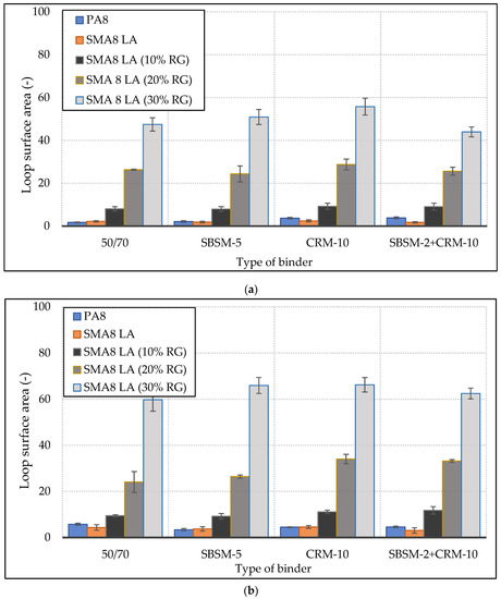 - The type of binder significantly affects the values of the hysteresis loop area of SMA8 LA (20% RG) and SMA8 LA (30% RG) mixtures, especially at 35 °C. This means that these mixtures will have a higher capability to suppress vibrations and tire/road noise.