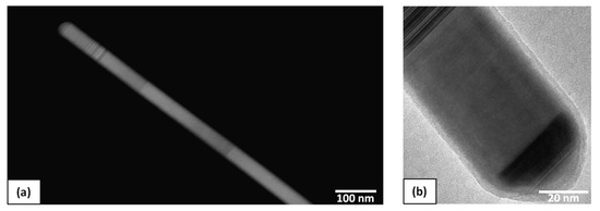 (a) HAADF-STEM image of a single GaAs NW; (b) HR TEM image of a single GaAs NW.
