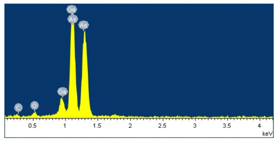 EDX analysis was carried out on several NWs. Figure 4 shows a typical EDX spectrum of GaAs NW. According to [30], peaks corresponding to In are observed in the EDX spectrum in the range from 3 to 4 keV. As can be seen from the figure, peaks corresponding to In are not observed in the EDX spectrum of grown NWs. Thus, indium was not detected along the entire length of NWs, which indicates its complete evaporation from the substrate surface before the GaAs NWs growth.
