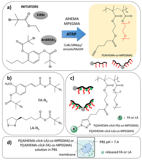 Our earlier interest was devoted to the encapsulation of vitamin C and FA into the micelles of the self-assembling polymers [43] with an incorporated unit of vitamin A (retinol) [44] or its derivative (4-n-butylresorcinol) [45] as an accompanying biocompatible substance. Recently, we have focused on conjugate-type delivery systems with covalently attached FA and LA. The main part of the current study is to design amphiphilic graft copolymers of poly(ethylene glycol) methyl ether methacrylate (MPEGMA) and alkyne functionalized 2-hydroxyethyl methacrylate (AlHEMA) (P(AlHEMA-co-MPEGMA)), which can conjugate selected active substance (Figure 1). Additionally, the use of two different initiators in the copolymerization (monofunctional ethyl α-bromoisobutyrate (EiBBr) and bifunctional 4-n-butylresorcinol (4nBREBr2)) influences the topology of resultant copolymers, i.e., graft and V-shaped graft. The relatively high yield conjugation was accomplished using a “click” chemistry reaction between alkyne and azide groups as a convenient method to introduce LA or FA through their azide derivatives. The obtained polymer–antioxidant conjugates were physicochemically characterized, whereas their delivery capabilities were verified by monitoring of the in vitro release process under conditions similar to those on the human skin (PBS, pH = 7.4, 37 °C). The impact of the copolymer composition (relative ratios of MPEGMA/AlHEMA) and topology on the effectiveness of antioxidant conjugation seems to be crucial for future application of the designed conjugates as a beneficial delivery system in cosmetology in respect of the release rate and amount of active substance in the expected time interval.
