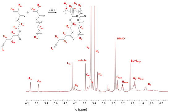 The monomer conversion was determined from the 1H NMR spectrum through the integration of the resonances corresponding to the monomer and polymer. The conversion of AlHEMA was evaluated by the protons of the methylene groups in AlHEMA units (Em: 4.30 ppm; Ep: 3.86–4.24 ppm). In the case of MPEGMA conversion, the peaks assigned to–OCH2CH2O–in the monomer and those in the polymer (Cm: 3.45 ppm; Cp: 3.51 ppm) were used for calculation (Figure 2). The conversion of the monomers was additionally determined by GC analysis which showed very good agreement with that obtained by 1H NMR, but the GC-based values were used to minimize the error of calculations of polymerization degree and molecular weight (DP, Mn,GC).