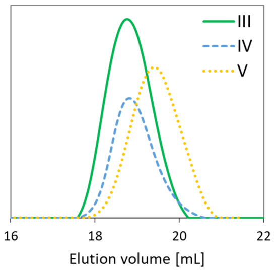 The polymerization reactions were completed with monomer conversions in the range of 40–71% for AlHEMA and 24–60% for MPEGMA to obtain, in most cases, a DP above 160 (Table 1). Reaction IV, which took place over 5 h, resulted in an increase in conversion compared to the reaction III, yielding a polymer with a longer main chain (DP = 183 vs. 114, respectively). The initiator type, including the previously described “bio”initiator in the copolymerization of HEMA and methyl methacrylate or MPEGMA [45], is not a significant factor, which affects the rate of polyreaction with predominated AlHEMA (II, V), providing conversions of ~45%. In the case of systems with predominated MPEGMA, the initiation by the “bio”initiator resulted in a lower conversions when compared to the standard initiator (III vs. I), but they are still advantageous due to the improvement of skin treatment from the point of view of application in cosmetology. By comparing the relative comonomer conversions of AlHEMA vs. MPEGMA within the system, the statistical copolymers were obtained in the presence of a monofunctional initiator, i.e., EiBBr (I-II, XAlHEMA ~ XMPEGMA), while in the case of the bifunctional initiator 4nBREBr2 the V-shaped copolymers with gradient were formed at twice lower conversion of MPEGMA than for AlHEMA.