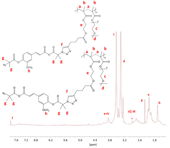 Poly(ethylene glycol) methyl ether methacrylate (MPEGMA, Aldrich, Mn = 500 g/mol, 97%, Poznań, Poland), 2-hydroxyethyl methacrylate (HEMA, Aldrich, 97%, Poznań, Poland), methanol (Alfa Aesar, 99%, Warsaw, Poland) and anisole (Alfa Aesar, 99%, Warsaw, Poland) and copper (I) bromide (CuBr, Fluka, 98%, Steinheim, Germany) were prepared as was reported earlier [45]. 4,4-Dinonyl-2,2-dipyridyl (dNdpy, Aldrich, 97%, Poznań, Poland), N,N,N′,N″,N″-pentamethyldiethylenetriamine (PMDETA, Aldrich, 98%, Poznań, Poland), triethylamine (TEA, Aldrich, 99%, Poznań, Poland), pyridine (Aldrich, 99%, Poznań, Poland), 2-bromoisobutyryl bromide (BriBuBr, Aldrich, 98%, Poznań, Poland), 5-hexynoic acid (HexA, Acros, 97%, Geel, Belgium), 4-n-butylbenzene-1,3-diol (4nBRE, Ark Pharm, 95%, Gdańsk, Poland), ethyl α-bromoisobutyrate (EiBBr, Aldrich, 98%, Poznań, Poland), sodium azide (NaN3, Acros, 99%, Karlsruhe, Germany), N,N′-dicyclohexylcarbodiimide (DCC, Acros, 99%, Geel, Belgium), 4-dimethylaminopyridin (DMAP, Acros, 99%, Geel, Belgium), N,N-dimethylformamide (DMF, 99%, Chempure, Piekary Śląskie, Poland), tetrahydrofuran (THF, Chempure, Piekary Śląskie, Poland), 4-hydroxy-3-methoxycinnamic acid called as ferulic acid (FA, Acros, 99%, Geel, Belgium), (±)-α-lipoic acid (LA, Aldrich, 99%, Poznań, Poland), and 0.1 M sodium phosphate buffer saline (PBS; pH = 7.4, Aldrich, Poznań, Poland) were used as received.