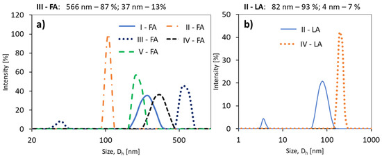 The DLS analysis of the samples in PBS solution indicated the formation of homogeneous particles and monomodal signals except for the conjugates of copolymer II with LA and III with FA (Figure 5). Generally, both grafted and V-shape grafted conjugates show trends of reducing hydrodynamic diameters (Dh) with an increase in the drug content (Table 2). A similar relationship has been previously reported for polymethacrylate–methotrexate conjugates [46]. By comparing the samples based on the same copolymer matrix (II or IV), to which LA and FA units were attached, it is noted that the particles of the LA conjugates are smaller (II-LA/II-FA = 82/106 nm or IV-LA/IV-FA = 202/323 nm) (Table 2).