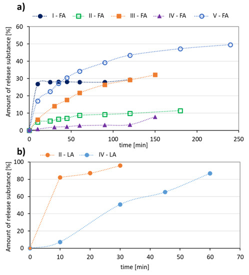 The release experiments carried out in PBS at pH = 7.4 showed that this process occurred faster for LA systems yielding 87–96% of released antioxidant in up to 1 h (Figure 6b). Additionally, a higher content of the hydrophobic fraction in the conjugate promotes a large ejection of the substance immediately after the start of release and the maximum value was reached within half an hour (II-LA), while in the case of IV-LA, the release profile was gradual over 1 h (Figure 6b). The largest amount of FA (49%) was released from the conjugate V, with the highest DC and over the longest time (up to 4 h, Figure 6a). The other conjugates released 10–30% of FA as maximum amounts within 2–3 h.
