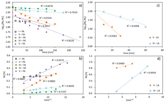FA (a,b) and LA (c,d) release profiles from polymer conjugates fitted using a first-order equation (a,c), and a plot of the released drug vs. square root of time according to the Higuchi equation model (b,d).