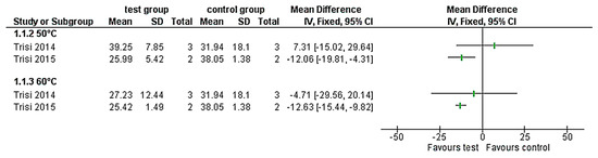 Forest-plots of the bone-to-implant contact ratio (%) values of the thermally treated implants (50 °C and 60 °C) compared with the control group.