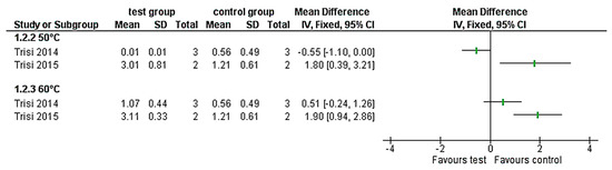 BIC around implants after thermal treatment and infrabony implant pockets after thermal treatment were considered as outcomes to describe differences between test and control groups after thermal treatment. Effect sizes of continuous outcomes for each study were reported as mean differences, along with 95% confidence intervals (CI We planned to conduct a meta-analysis only if studies were comparable, i.e., if treatments, participants, and the underlying clinical question are similar enough for pooling. To evaluate the statistical heterogeneity between studies, the Q-test of homogeneity and I2 statistics as a percentage of the total variability across studies were used. The significance level of the Q-test was set to 0.10, and I2 values were categorized as 25%, 50%, and 75% for low, moderate, and high heterogeneity, respectively [26]. All analyses were performed with RevMan 5.3.5 (Cochrane C., London, UK). Given the clinical heterogeneity across trials, we have abstained from summarizing the study specific effects into one overall effect. Results were expressed by effect sizes for each study and corresponding forest plots.