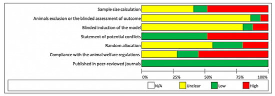 For quality assessment of studies, the CAMARADES study quality checklist was applied [25]. The bias evaluation included sample size calculation, animal exclusion or the blinded assessment of outcome, blinded induction of the model, statement of potential conflicts, random allocation, compliance with the animal welfare regulations, and whether the studies were published in peer-reviewed journals.
