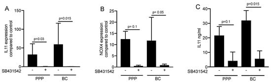 To confirm the involvement of TGF-β signaling to regulate the respective genes, the TGF-β receptor 1 antagonist SB431542 was introduced [32]. We report that SB431542 blocked the activity of PPP and buffy coat lysates to increase the expression of IL11 and NOX4 (Figure 4A,B). Further support for the involvement of TGF-β signaling comes from the immunoassay, showing that SB431542 blocked the accumulation of IL11 in the supernatant of cells exposed to PPP and buffy coat lysates (Figure 4C). These observations support the notion that the effects of the PPP and buffy coat lysates are mediated via the TGF-β receptor.