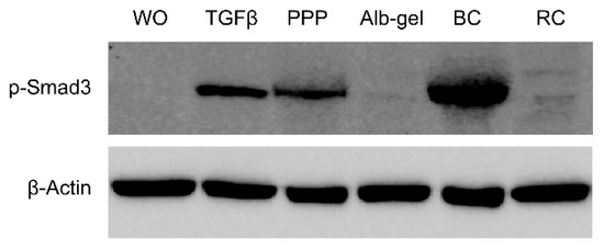 Knowing that phosphorylation of Smad3 is a prerequisite for its nuclear translocation, it was demonstrated that both the PPP lysates and buffy coat C-PRF layer activated the increased phosphorylation of Smad3, while heated PPP and red blood lysates had no effects (Figure 6).