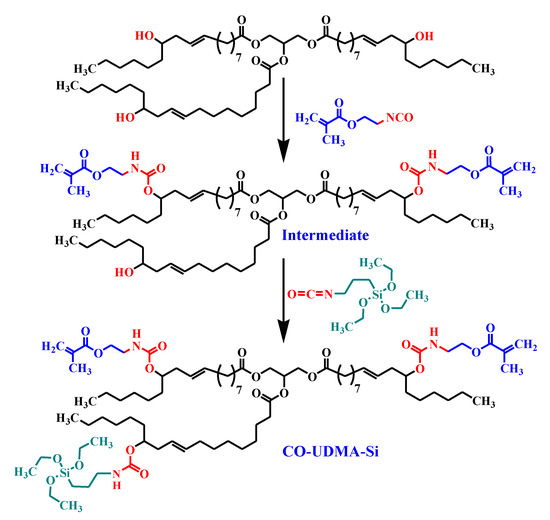 Schematic diagram of Castor Oil Urethane Dimethacrylate with Silane Sequences (CO-UDMA-Si) monomer preparation.