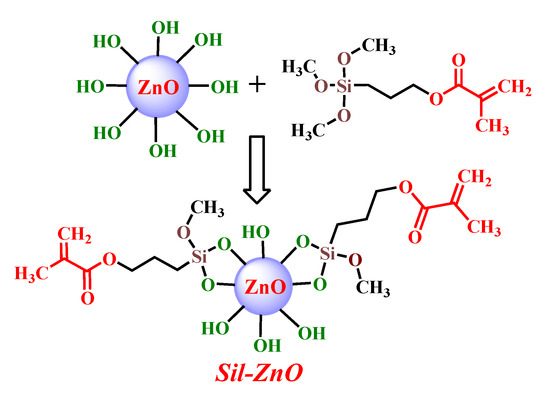 The chemical functionalization of ZnO nanoparticles is possible due to the presence on their surface of a variable number of hydroxyl groups, capable of interacting under predetermined conditions with various low molecular weight compounds, the alkoxysilane derivatives being preferred [32,33,34]. Thus, in this study, ZnO nanoparticles were functionalized with 3-(trimethoxysilyl)propyl methacrylate (Figure 2), envisaging that silane units will react with the OH groups of ZnO NPs, while the methacrylate sequences will be available to participate in the further photopolymerization reaction along with the selected urethane dimethacrylate monomers CO-UDMA-Si and PPO-UDMA.