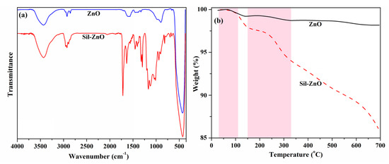 Fourier transform infrared (FTIR) spectra (a) and thermogravimetric analysis (TGA)thermograms (b) of ZnO and Sil-ZnO nanoparticles.