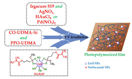 A convenient and straightforward approach frequently used to insure a facile handling, employment and recovery of the inorganic nanoparticles consists in their homogeneous dispersion into polymer matrices, which besides reducing their agglomeration tendency also enhance their chemical stability [18]. Hence, ZnO NPs previously functionalized with photopolymerizable sequences were incorporated in urethane dimethacrylate mixture (gravimetric ratio given in Table 1) and were photopolymerized by UV light irradiation for 600 s in the presence of Irgacure 819 as photoinitiator. Additionally, noble metal nanoparticles (Ag, Au, Pd) were in situ photogenerated in the hybrid matrices concomitant with the polymerization process by adding the corresponding noble metal salts (AgNO3, HAuCl4 or Pd(NO3)2), which determines the formation of coatings with a homogeneous distribution of nanoparticles (Figure 4).