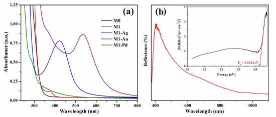 UV-vis absorption spectra for M0, M1, M1-Ag, M1-Au and M1-Pd samples (a) and reflectance spectrum of M1 film (b). Inset of (b) representation of Kubelka–Munk function for M1 sample.