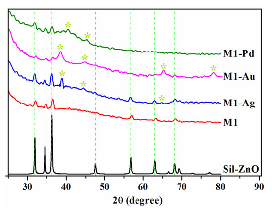 X-ray diffraction (XRD) patterns of Sil-ZnO nanoparticles and of M1, M1-Ag, M1-Au and M1-Pd hybrid films (* indicates the diffraction peaks given by noble metal nanoparticles Ag, Au and Pd, respectively).